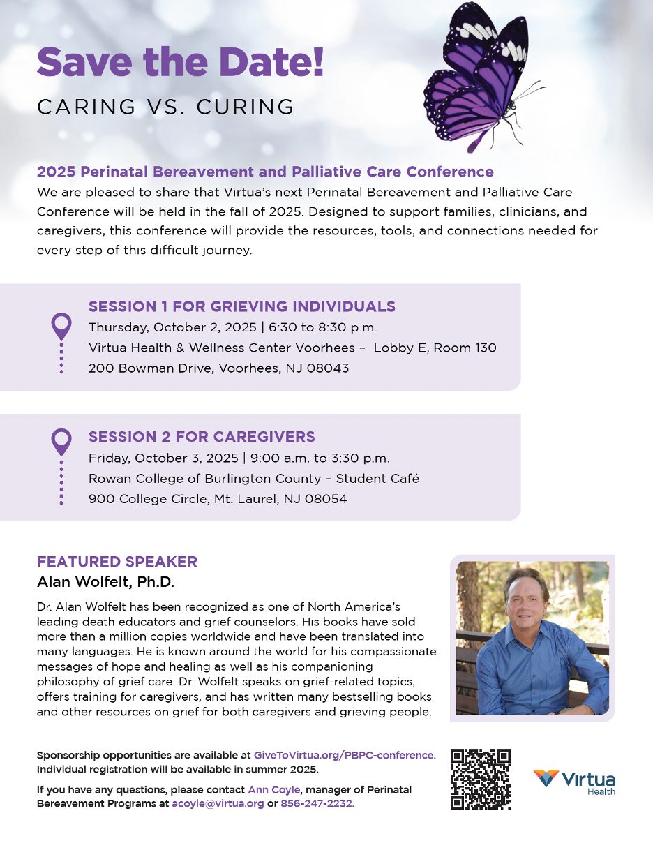 We are honored to be an exhibitor at the 2025 Perinatal Bereavement and Palliative Care Conference, “Curing vs. Caring,” taking place on Friday, October 3, 2025 from 9 AM - 3:30 PM at Rowan College at Burlington County (Student Café, 900 College Circle, Mt. Laurel, NJ).